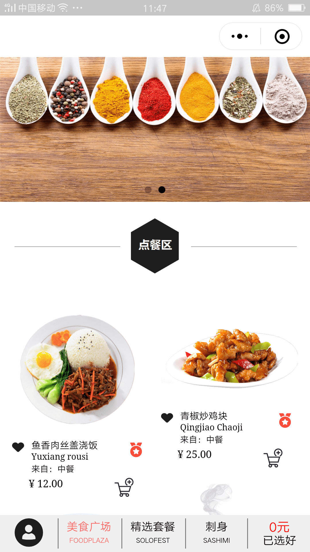 (3)分类推荐:设置模块,分类推荐精选套餐、刺身菜单,方便用户快速找到特定菜品。